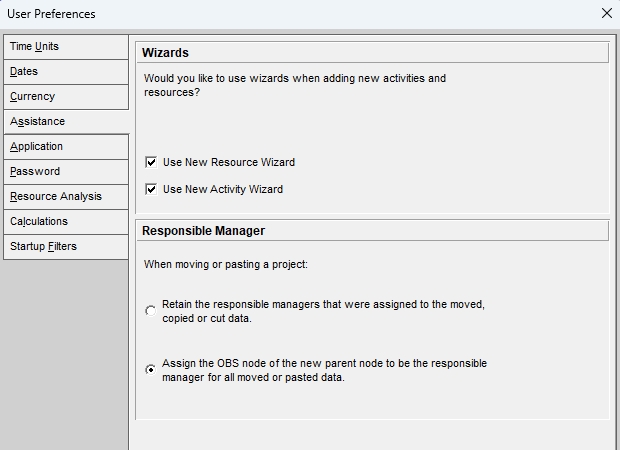 The User Preferences options now include a shortcut that will help to streamline some of the processes when you are copying a project. In the Assistance tab you’ll find an option to control the assignment of the OBS to a copied project. You can decide for yourself whether to retain the responsible managers that were assigned to the moved, copied, or cut data or to assign the OBS node of the new parent node to be the responsible manager for all moved or pasted data. Just click next to the option you choose.