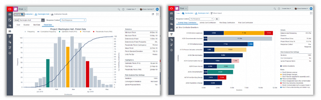 Pre-built Histogram and Tornado Charts based on Monte Carlo analysis techniques can be used to create clear, visual reports for pre-response or post-response analysis, or both, giving quantitative visibility into the likelihood of meeting project or activity dates.
